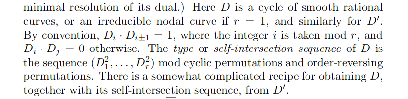 Find a good interpretation for the matrix \(M = (D_i \cdot D_j), \operatorname{tr}(M), \operatorname{det}(M)\), etc. It looks like the self-intersection sequence above is \(\operatorname{tr}(M)\).