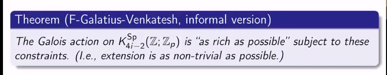 Tony Feng, “The Galois action on symplectic K-theory”, EAKTS. https://www.youtube.com/watch?v=Ulm8bCcuW2Q See https://www.mit.edu/~fengt/Galois_action_on_KSp.pdf#page=1