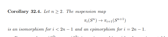 If \(X\) is an \(n{\hbox{-}}\) connected CW complex, then there are maps \(\pi_i X \to \pi_{i+1} \Sigma X\) which is an isomorphism for \(i\leq 2n\) and a surjection for \(i=2n+1\).
