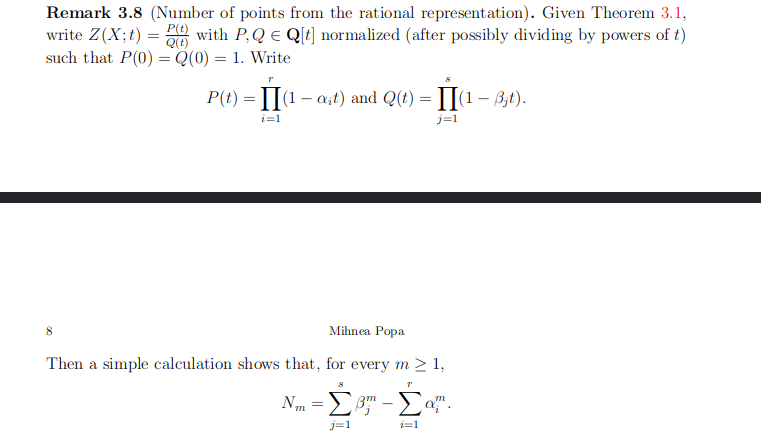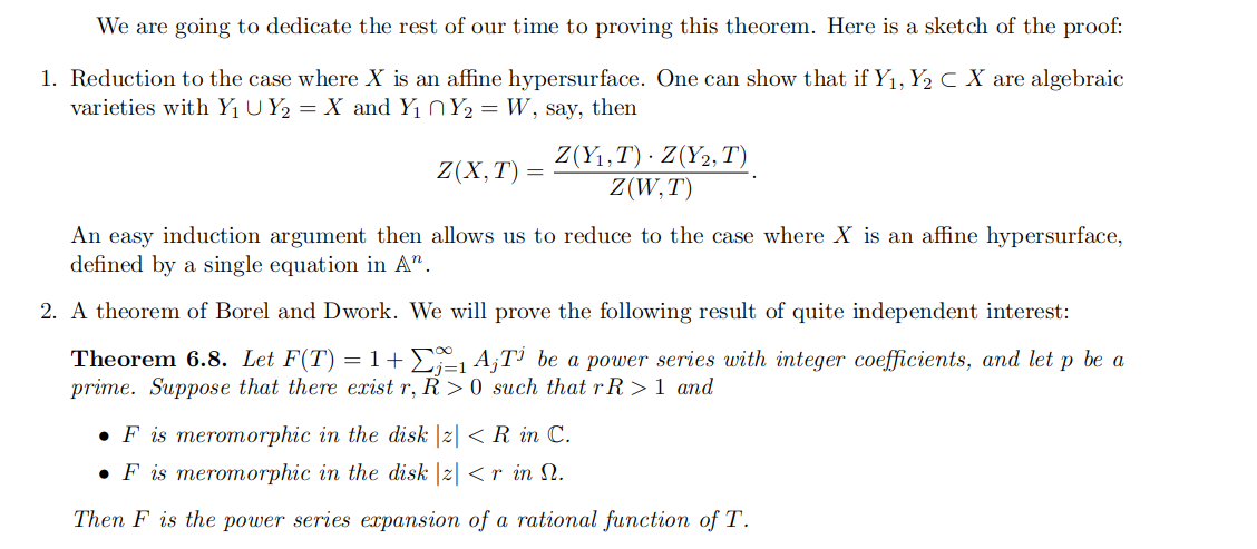 There are two obvious conjectures, and one is significantly stronger than the other. We could ask whether \(\zeta\left(X_{0}, t\right)\) has rational coefficients, or more generally whether each individual \(P_{i}(t)\) has rational coefficients and is independent of the choice of \(l\). We are now in a position where proof of the former is relatively straightforward, and the latter statement can be reduced to a statement about absolute values of eigenvalues.