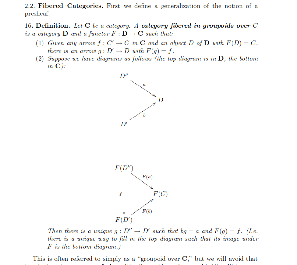 Fix a category \(\mathsf{T}\), eg \(\mathsf{T} = {\mathsf{Top}}\), then consider $\mathsf{X}\in \mathsf{Cat}_{/ {\mathsf{T}}} $ a category over \(T\) defined by \(\mathsf{X} \xrightarrow{\pi }\mathsf{T}\). Then \(\mathsf{X}\) is fibered in groupoids iff
