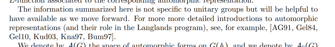 Write the space of automorphic functions as \begin{align*} {\mathcal{A}}\coloneqq C^\infty\qty{\dcoset{\operatorname{GL}_n(\widehat{{\mathbf{Z}}})}{\operatorname{GL}_n({\mathbf{A}}_{{\mathbf{Q}}})}{\operatorname{GL}_n({\mathbf{Q}}) )} \longrightarrow{\mathbf{C}}} \end{align*}