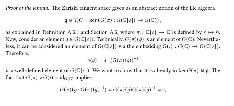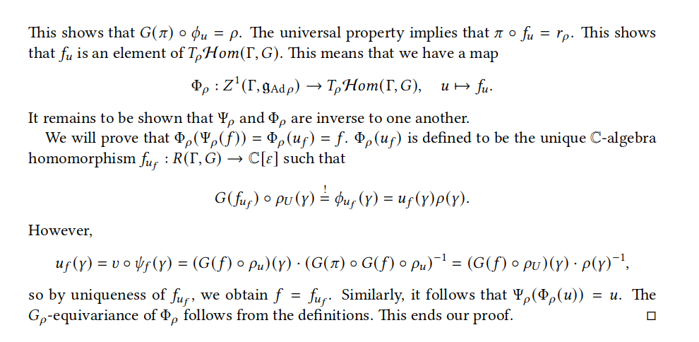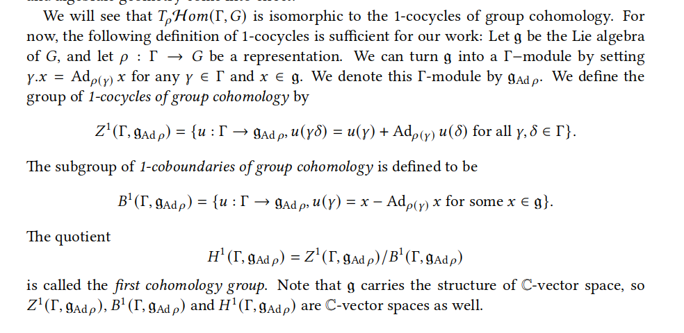 - The Zariski tangent spaces are isomorphic to 1-cocycles in group cohomology: \({\mathbf{T}}_\rho \widehat{\mathop{\mathrm{Hom}}}_{\mathsf{Grp}}(\pi, G) \cong Z^1_{\mathsf{Grp}}(\pi, {\mathfrak{g}}_{{ \operatorname{Ad} }\rho})\).