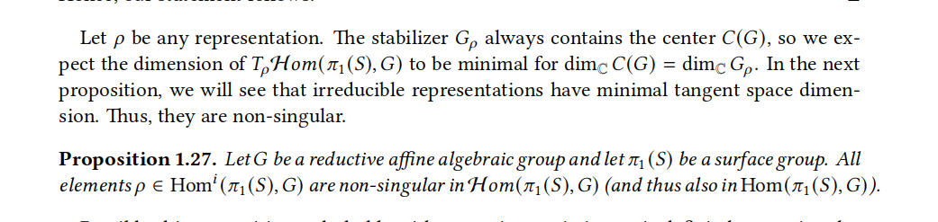- For \(\pi = \pi_1\Sigma_g\) a surface group, the irreducible locus \({\mathcal{X}}^{\mathrm{irr}}(\pi, G)\) is a complex orbifold (Sik09) and Goldman computes \(\dim_{\mathbf{C}}{\mathcal{X}}^{\mathrm{irr}}(\pi, G) = (2g-2)\dim_{\mathbf{C}}G + 2\dim_{\mathbf{C}}Z(G)\) where \(Z(G)\) is the center of \(G\).