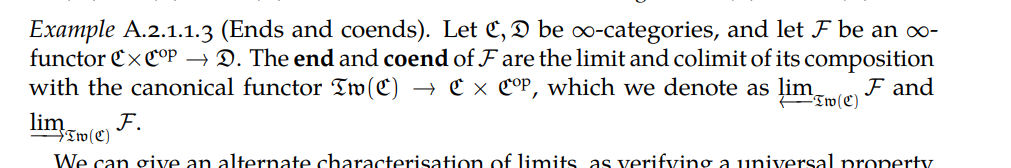 - Analogy: limits are right adjoints to diagonals, and ends are right adjoints to homs.